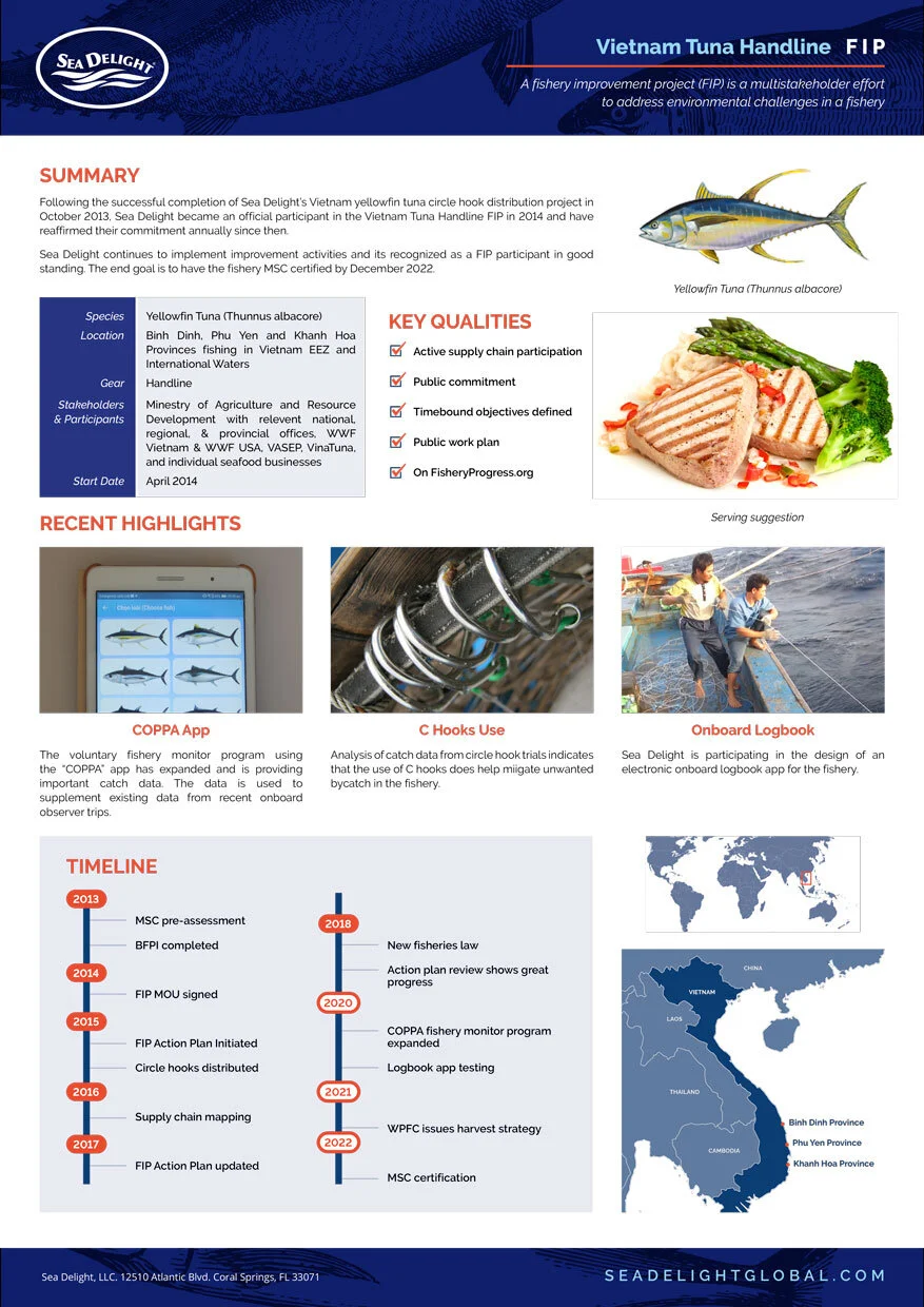 Sea Delight has sourced yellowfin tuna from the handline and longline fisheries in Vietnam since 2011.Starting March 27, 2012 Sea Delight began implementing improvements within their own supply chain through a better fishing practices initiative (BFPI). The overarching goals of the BFPI were to increase the use of circle hooks among longline fishing vessels, increase observer coverage aboard longline vessels, and move the BFPI toward a FIP.